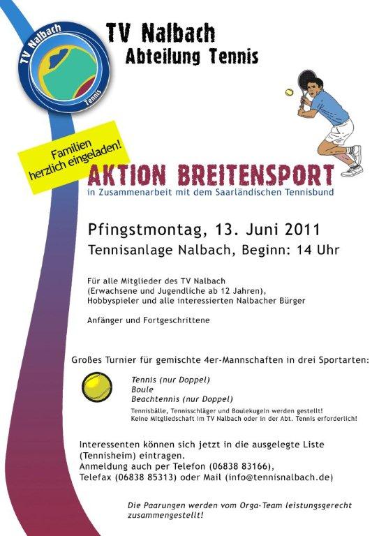 Am Pfingsmontag, 13.06.2011 findet für alle Mitglieder des TV Nalbach, Hobbyspielern und alle interessierten Nalbacher Bürger ab 14. 00 Uhr wieder ein Breitensportturnier statt.